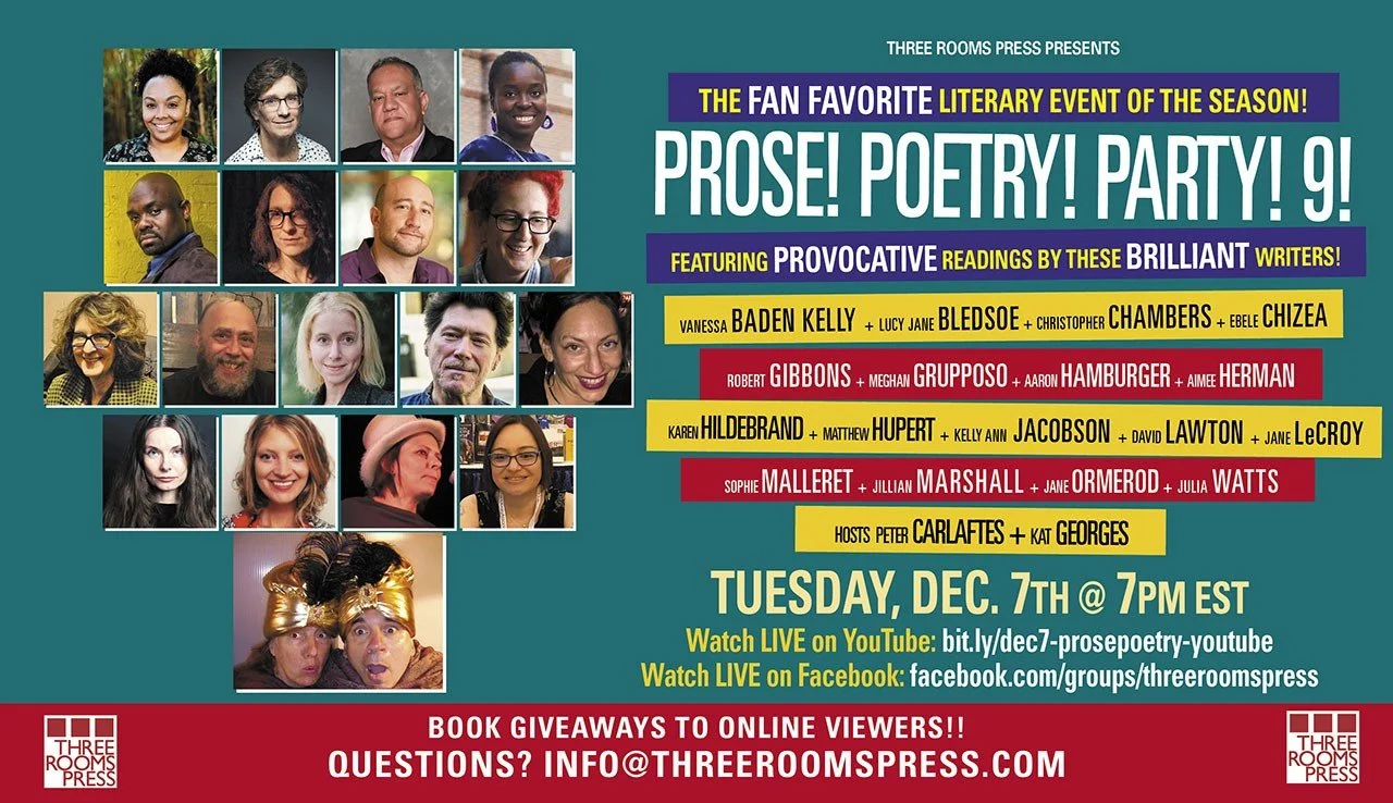 Join Three Rooms Press Tuesday, December 7, 2021 as we celebrate our favorite literary event of the year: PROSE! POETRY! PARTY! 9! featuring 17 poets and authors in a PROVOCATIVE reading LIVESTREAMED to Facebook and Youtube.